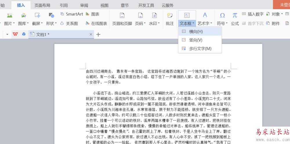 2、點擊插入選擇文本框,選擇橫向,如圖。
