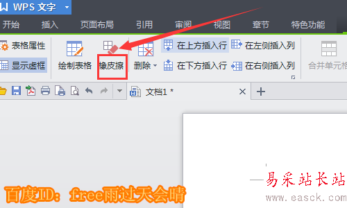 4、上面繪制表格的時候我為了左右對稱所以畫的都是通著的直線,但有很多是我們用不著的,這個時候我們點擊“表格工具”下面的“橡皮擦”,鼠標箭頭會變成橡皮的形狀。