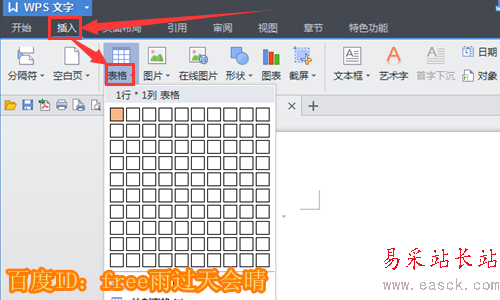 2、點擊插入后我們再選擇“表格”,然后會看到下圖所示的下拉框,這些方格分別代表的是單行單列,你可以根據(jù)自己的需要添加。為了做平面圖,小編在這里選取的是一行一列。