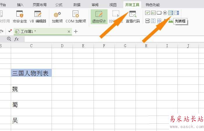 2、接著,鼠標左鍵單擊【開發工具】,選擇【列表框】圖標,如下圖所示。