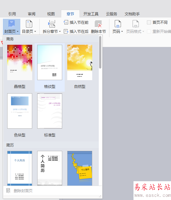 6、點擊封面按鈕,進行封面樣式的選擇,如圖所示;