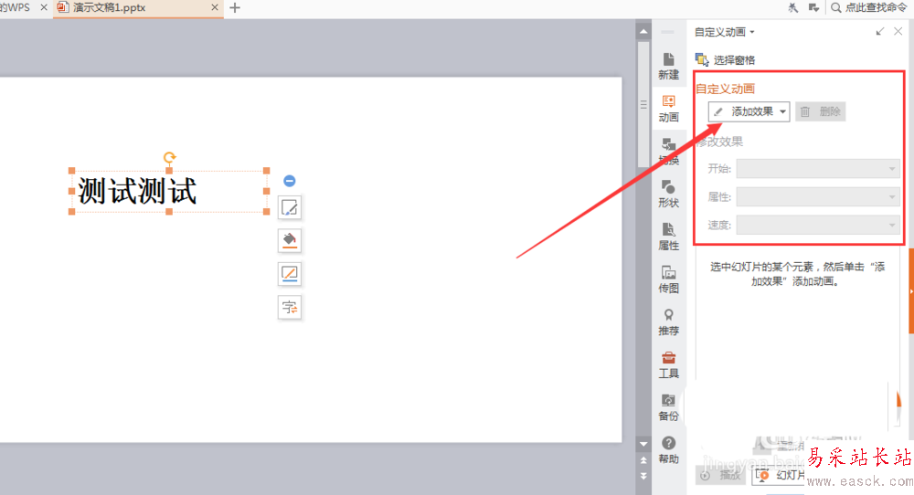 4、這時(shí)右側(cè)會(huì)出現(xiàn)動(dòng)畫效果設(shè)置欄,我們選擇(添加效果)