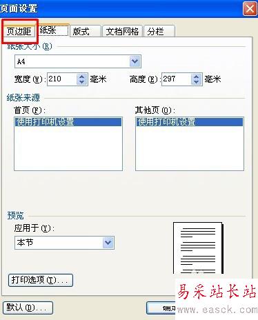 3、在頁邊距上設置頁邊距上下左右都為40毫米,當然也可以根據自己的需要設置。