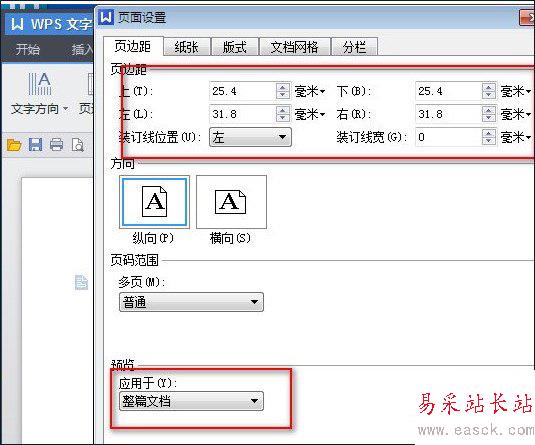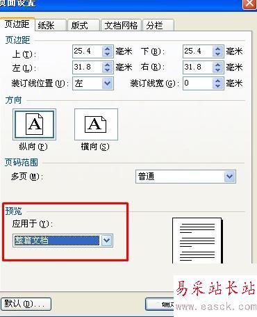 3、在【頁面設置】對話框中,可以看到上方是設置頁邊距的數值,有上、下、左、右四邊,可以分別設置不同的數值,數值越少頁邊距越短;下方是根據設定的數值進行預覽,默認應用于整篇文檔。