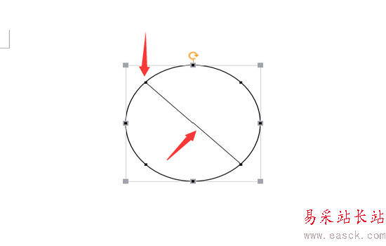 4、使用【形狀】工具中的【直線】,選擇之后,將十字光標移到之前的圓形外邊框上,這時,邊框上會出現8個鏈接點,如下圖,我們選擇其中斜線的兩個連成直線。
