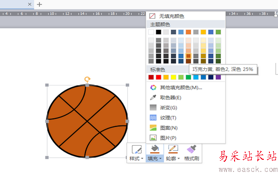 7、最后,設置籃球的外邊框線型為2.5,充填色為【巧克力黃】,如下圖,這樣一個籃球就畫好了。