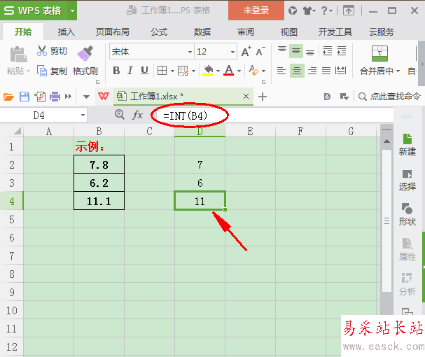 6、同樣的在D4單元格輸入公式“=INT(B4)”,返回數值是整數11,無論小數后面的數值多大都只返回整數(如圖)。
