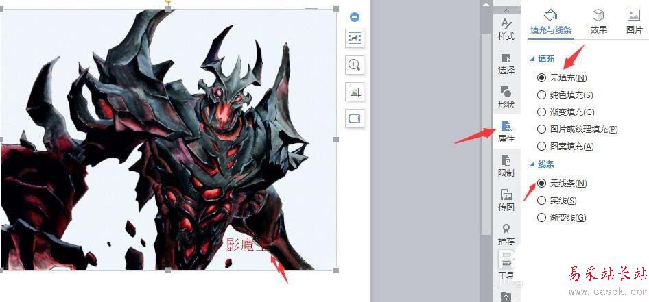 6、選擇文本框,選擇右側“屬性”,設置填充為無填充,設置線條為無線條,效果如圖,現在就可以將這個張圖片另存了