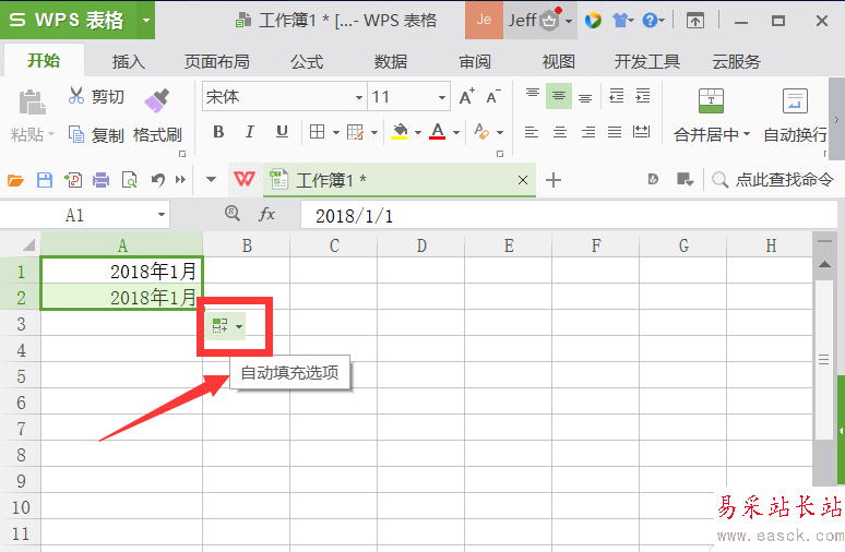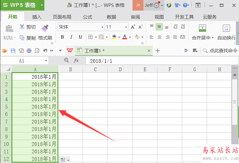 2、如果按常規(guī)一個(gè)一個(gè)輸入時(shí)可以的,但是效率低點(diǎn)。如果直接輸入第一個(gè)2018年1月,然后按住鼠標(biāo)拖動(dòng),會(huì)出現(xiàn)如下效果,顯然沒(méi)有達(dá)到效果。