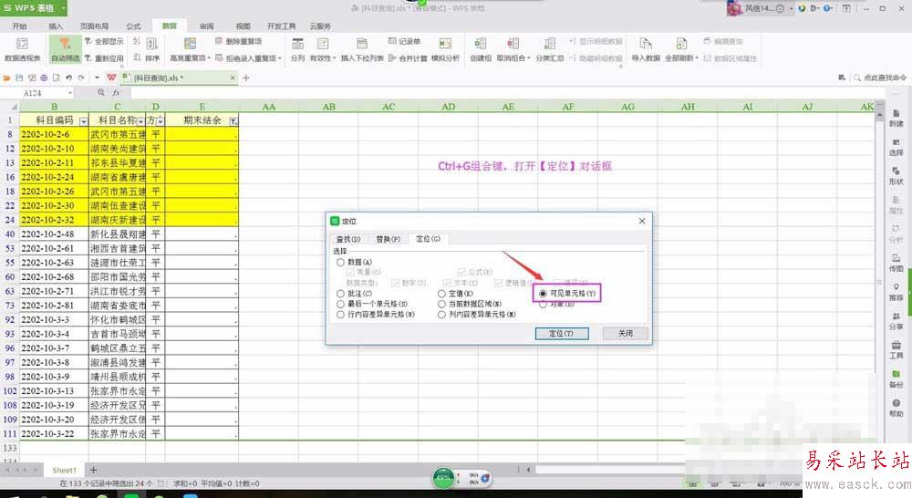 Ctrl+G組合鍵,打開【定位】對話框,在對話框中選擇【可見單元格】,單擊【定位】按鈕。如下圖所示: