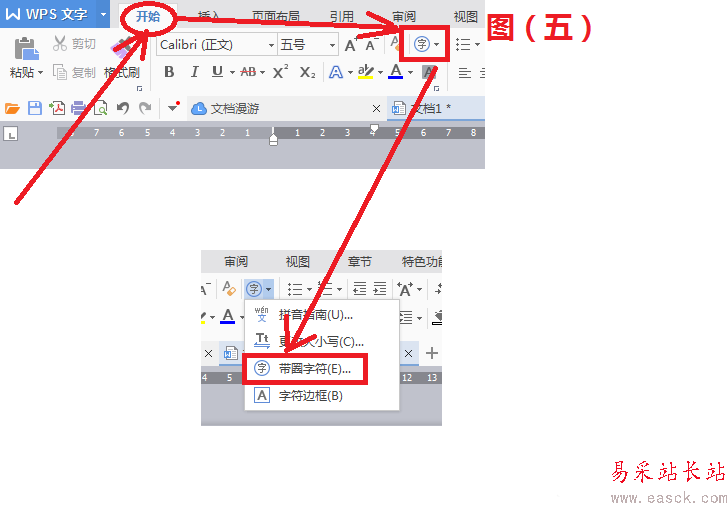 5、打開【開始】選項卡,點擊帶圈字符按按鈕,在下接菜單中選擇【帶圈字符】如下圖(五)所示