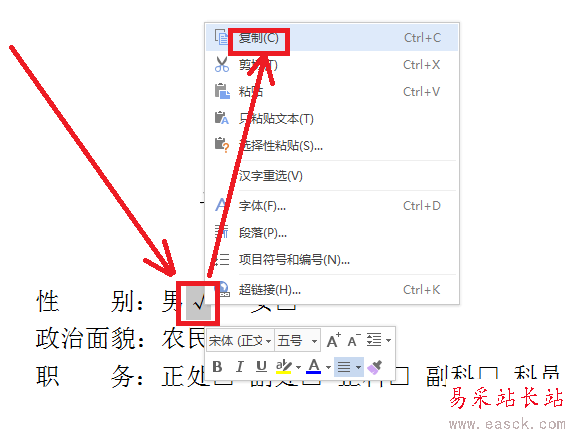 4、選中“√”,然后按ctrl+c復制,或者右鍵菜單復制。如下圖(四)所示。