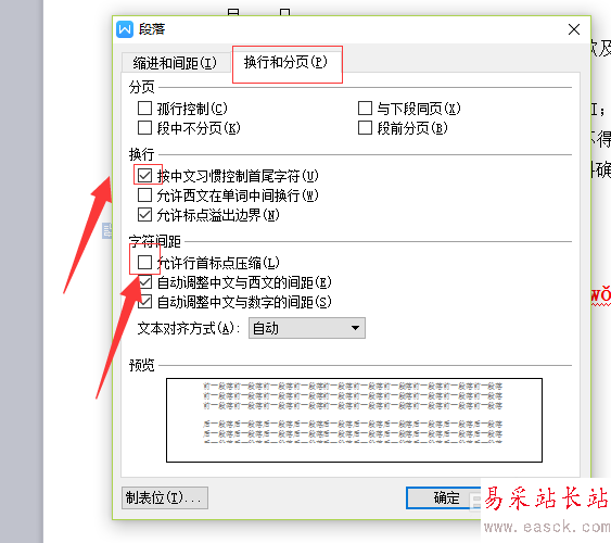 3、然后對換行和分頁菜單下邊的子菜單“按中文習慣控制首尾字符”,然后在勾選一下字符間距“允許首行字符壓縮”