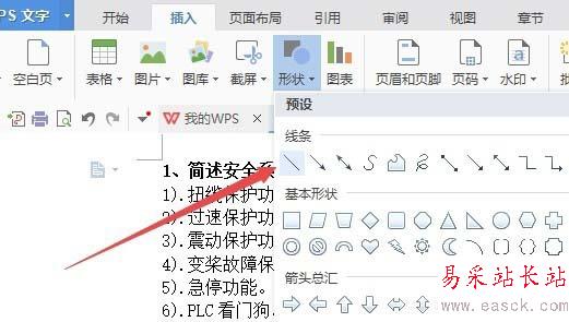 6、在插入工具欄上點擊“形狀”按鈕,在彈出的下拉菜單中點擊“直線”線條。