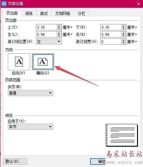 4、接著設置好試卷的方向 為橫向,最后點擊確定按鈕 。