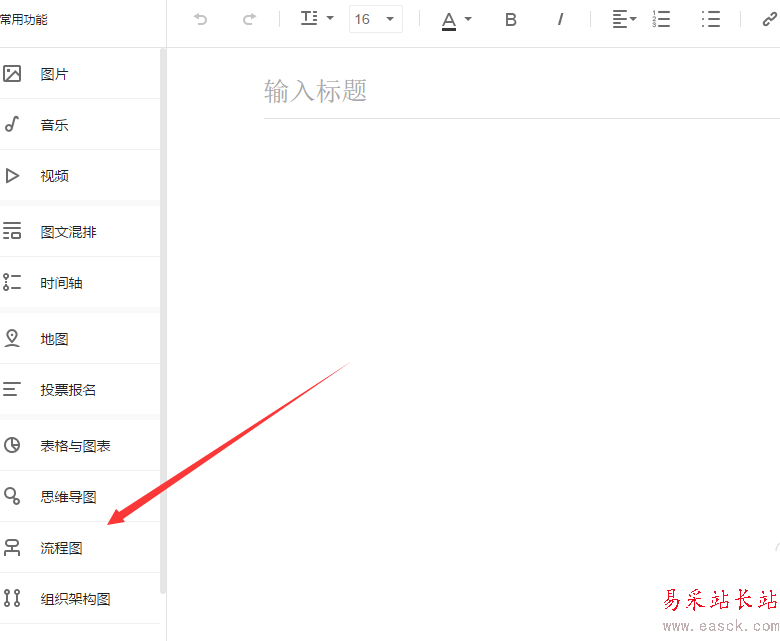 4、下面會進入正式的編輯頁面,編輯頁面的左側(cè)有各種選項,比如流程圖,思維導(dǎo)圖、組織架構(gòu)圖等等選項,我們選擇自己要使用的功能即可,比如我們選擇流程圖。