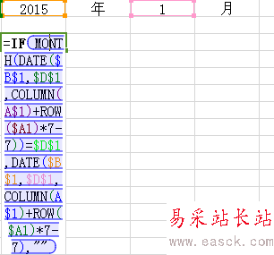 3、在B3單元格里編輯公式“=IF(MONTH(DATE($B$1,$D$1,COLUMN(A$1)+ROW($A1)*7-7))=$D$1,DATE($B$1,$D$1,COLUMN(A$1)+ROW($A1)*7-7),"")”。設置單元格格式為:自定義-“d"。