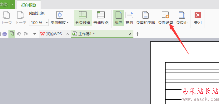 7、我們也可以直接在打印時進行設置,我們點擊“打印預覽”后,會看到上面工具欄上有一個“頁面設置”,我們點擊直接設置,設置后再打印也可以。