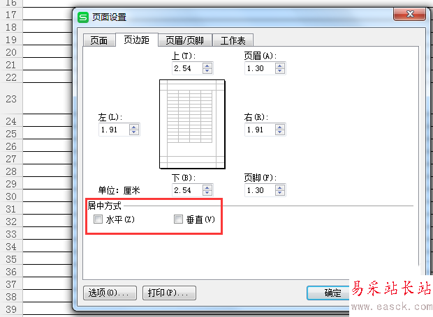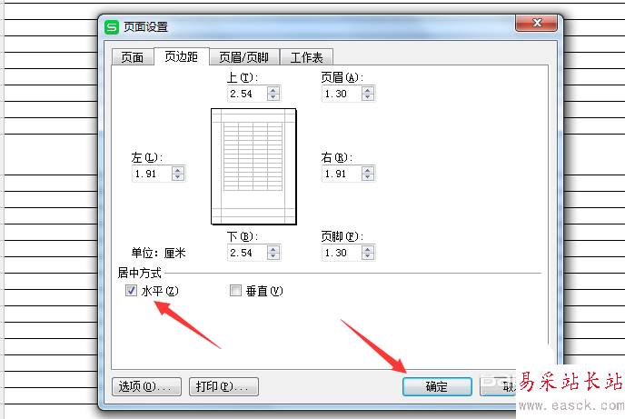 5、這時我們將“居中方式”中的“水平”勾選上,點擊“確定”,這樣左右頁邊距就一樣啦。(“垂直”根據自己的需求勾選)
