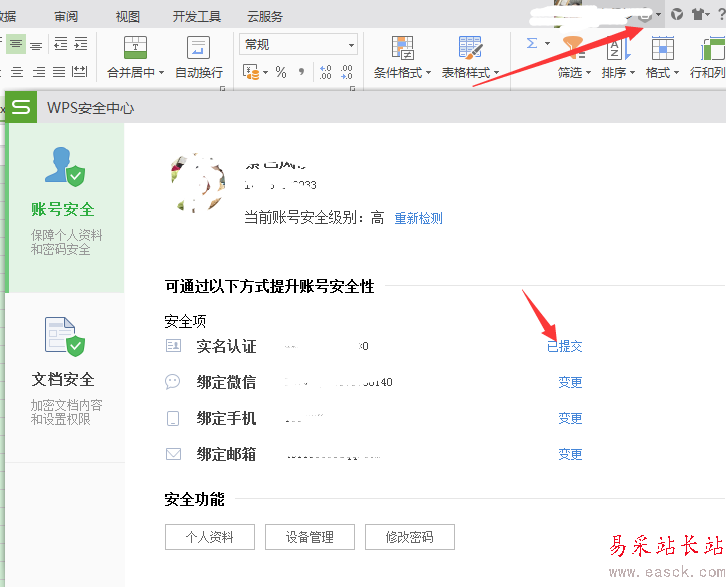 7、返回到wps的安全中的時候,可以看到【實名認(rèn)證】這項選擇中顯示的事【已提交】。等待認(rèn)證通過即可。通過之后再分享是可以使用哪些功能。