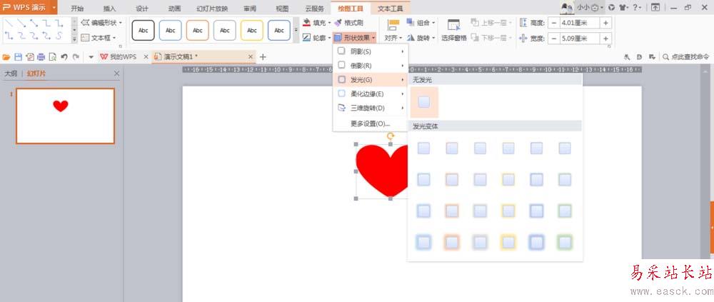 5、點擊上方的形狀效果,點擊發光里選擇合適的選項。這樣就完成了發光紅心的制作。