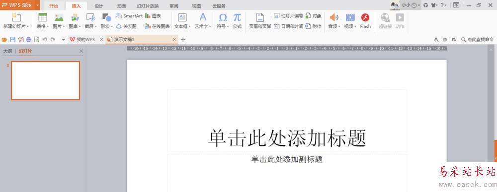 1、打開wps演示后新建一個演示文稿。點擊插入。
