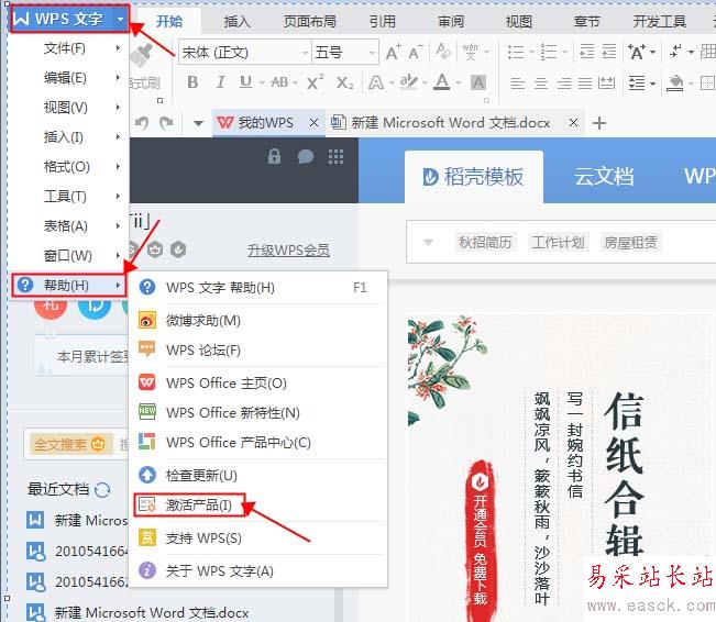 5、登錄成功后,我們點擊右上角的"wps文字"--“幫助”--“激活產品”