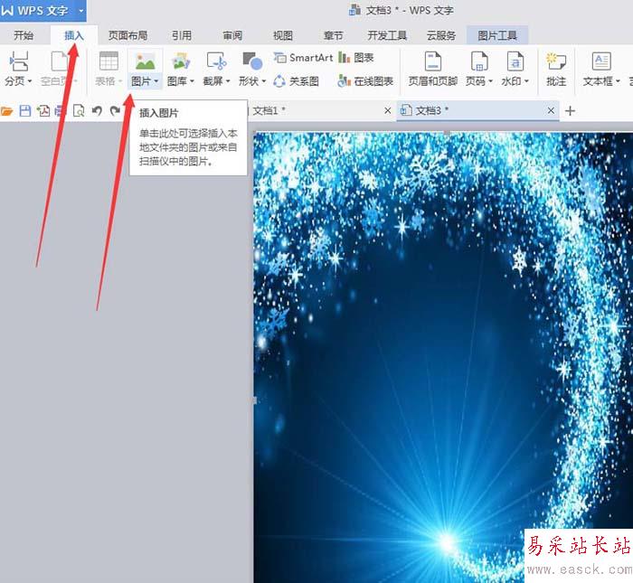 1、在菜單”插入“欄里面選擇”圖片“,把背景素材插入進文檔。然后把圖片平鋪整個頁面。