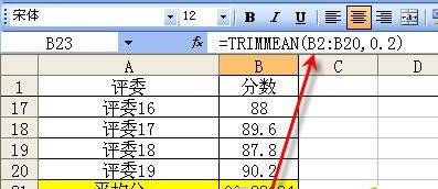這個(gè)方法思路固然簡(jiǎn)單,但公式實(shí)在是有點(diǎn)麻煩。在EXCEL中,其實(shí)是可以有更簡(jiǎn)單的方法的。那就是利用TRIMMEAN函數(shù)。如圖3所示,在B23單元格中輸入公式:=TRIMMEAN(B2:B20,0.2),回車(chē)后即可得到結(jié)果。