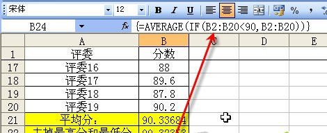 在B24單元格輸入如下公式:=AVERAGE(IF(B2:B20<90,B2:B20)),然后按下“Ctrl+Shift+Enter”快捷鍵,可以看到公式外層加了一對(duì)大括號(hào)(不可手工輸入此大括號(hào)),同時(shí)我們需要的結(jié)果也出來(lái)了,如圖4所示。