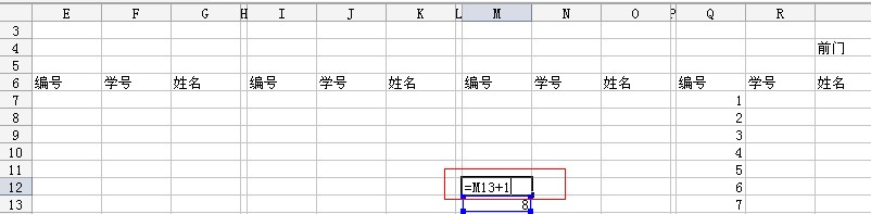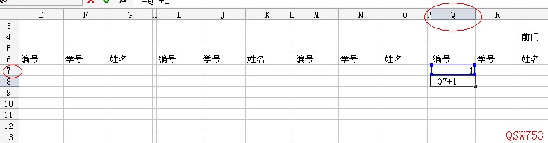 3. 一般進(jìn)門的第一個(gè)位置是“1”,那么我們就在Q列7行(以后簡(jiǎn)稱Q7)輸入“1”。Q8(Q列8行),中輸入“=Q7+1”。回車,就可以看到變成了8了。
