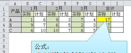 =SUMIF($A$2:$G$2,H$2,A3:G3)