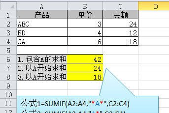 說明:如果需要進行模糊求和,就需要掌握通配符的使用,其中星號是表示任意多個字符,如"*A*"就表示a前和后有任意多個字符,即包含A。