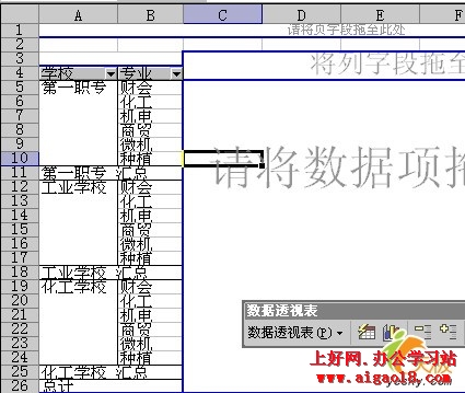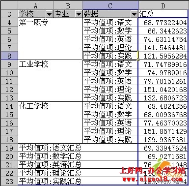根據要求,我們應該得到各學校、各專業、各學科的平均分數。因此,我們應該把“學校”、“專業”作為行字段,而把各學科數據作為數據項。