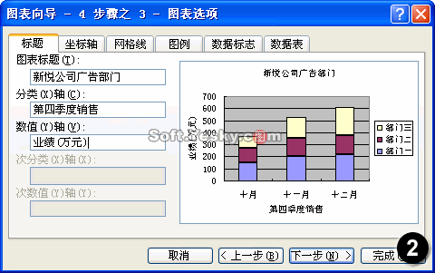 4. 單擊兩次“下一步”按鈕,進入“圖表選項”步驟,選擇“標題”選項卡,在“圖表標題”框中輸入“新悅公司廣告部門”;在“分類(X)軸”框中輸入“第四季度銷售”;在“數值(Y)軸”框中輸入“業績(萬元)”(圖 2)。