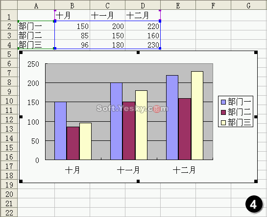 為了讓三個部門的業績情況更直觀的表顯示,他將通過Excel“圖表向導”,將數據轉化為圖表。