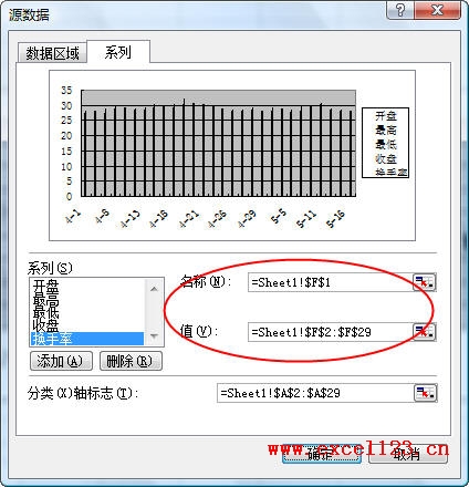2.添加“換手率”系列:選擇圖表,單擊菜單“圖表→源數據→系列”,在對話框中單擊“添加”按鈕,將“名稱”設置為F1單元格,將“值”設置為F2:F29區域。