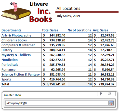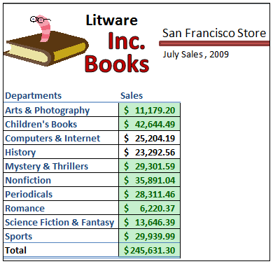 下面我們應用條件格式,以便能夠容易判斷是否位于本地分支機構的部門與該公司其它分支機構相比做得更好或更差。讓我們使用San Francisco分支機構作為我們的示例。我們將應用綠色背景填充那些比平均值高的部門。