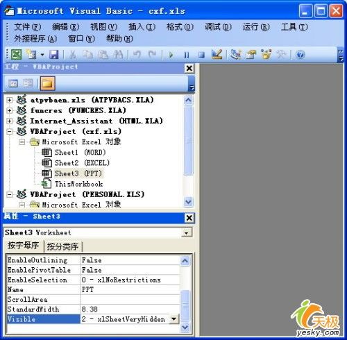 4、選中相應工作簿中需要隱藏的工作表(如“Sheet3(PPT)”),然后在下面的屬性窗口中,找到“Visible”選項,單擊其右側的下拉按鈕,在隨后出現的下拉列表中,選擇 “0-xlSheetVeryHidden”選項。