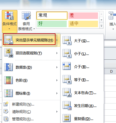 再次單擊“條件格式”,移動(dòng)鼠標(biāo)到顯示的下拉菜單“突出顯示單元格規(guī)則”上,在展開(kāi)的菜單中單擊“介于”命令,在彈出的對(duì)話框中輸入值“500”到“999”,設(shè)置為“自定義格式”,并在彈出的對(duì)話框中的“顏色”中選擇綠色。