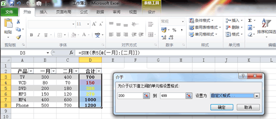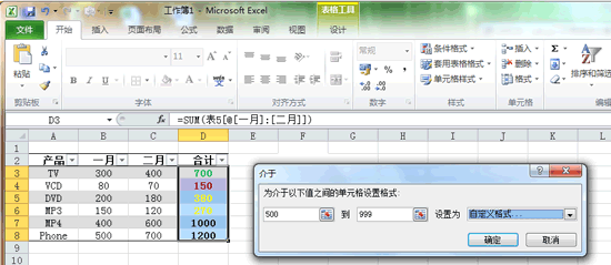 如果要對(duì)下表中“合計(jì)”列中的數(shù)據(jù)進(jìn)行不同顏色的區(qū)分,如:值小于200的用紅色表示,值在200與499之間的用黃色表示,值在500與999之間的用綠色表示,值在1000以上的加上邊框。怎么做?