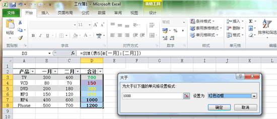 再次單擊“條件格式”,移動(dòng)鼠標(biāo)到顯示的下拉菜單“突出顯示單元格規(guī)則”上,在展開(kāi)的菜單中單擊“大于”命令,在彈出的對(duì)話框中輸入值“1000”,設(shè)置為“紅色邊框”。