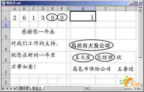 然后根據(jù)所用明信片的格式輸入不變的內(nèi)容,如祝福語、發(fā)信人等信息。再把需要變化的單元格中輸入公式(下圖圈出的位置)。