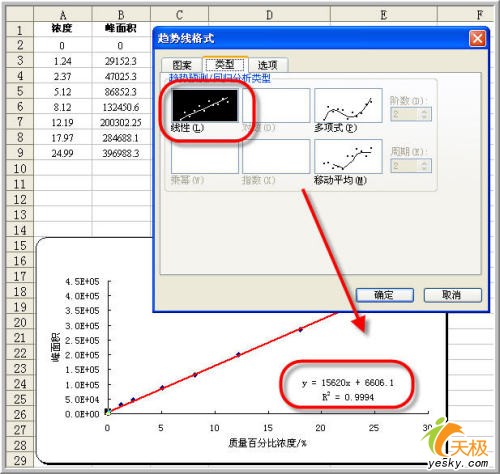 在選項卡中顯然詳細多了,注意選擇X、Y對應的數據列。“常數為零”就是指明該模型是嚴格的正比例模型,本例確實是這樣,因為在濃度為零時相應峰面積肯定為零。先前得出的回歸方程雖然擬合程度相當高,但是在x=0時,仍然有對應的數值,這顯然是一個可笑的結論。所以我們選擇“常數為零”。