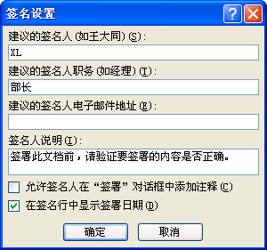 步驟二、在打開“簽名設(shè)置”對話框的相應(yīng)文本框中輸入信息,如圖所示,單擊“確定”按鈕,在工作表的相應(yīng)位置將添加文檔簽名行。