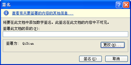 步驟二、打開“簽名”對話框,如圖所示,如果要說明簽署文檔的目的,可在“簽署此文檔的目的”文本框中輸入相應(yīng)的信息,然后單擊“簽名”按鈕,在打開的“簽名確認(rèn)”對話框中單擊“確定。按鈕完成不可見數(shù)字簽名的添加。