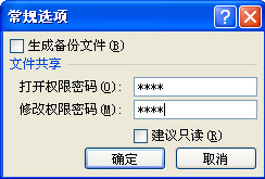 步驟二、打開“常規(guī)選項(xiàng)”對話框,在“文件共享”欄中的“打開權(quán)限密碼”和“修改權(quán)限密碼”文本框中分別輸入打開和修改工作薄的密碼,單擊“確定”按鈕,如圖所示。