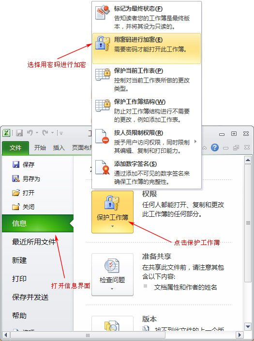 此外,如果只需要設(shè)置打開權(quán)限,還可在“文件”選項(xiàng)卡“信息”界面中單擊“保護(hù)工作簿”按鈕,在彈出的下拉菜單中選擇“用密碼進(jìn)行加密”命令,如圖所示,在打開的對話框中設(shè)置工作簿的打開密碼。