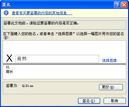 步驟三、雙擊該簽名行,在打開的對話框中單擊“確定”按鈕,打開“簽名”對話框,在其文本框中輸入姓名或插入圖片作為簽名,完成后單擊“簽名”按鈕,在打開的“簽名確認(rèn)”對話框中提示已成功添加簽名,單擊“確定”按鈕,如圖所示。