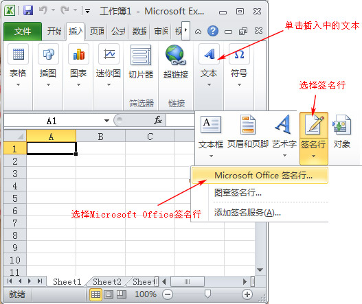 步驟一、打開需設(shè)置保護(hù)的工作薄,單擊“插入”選項(xiàng)卡,在“文本”組中單擊“簽名行”按鈕下的下拉按鈕,在彈出的下拉菜單中選擇“Microsoft Office簽名行”命令,如圖所示,然后在打開的提示對話框中單擊“確定”按鈕。